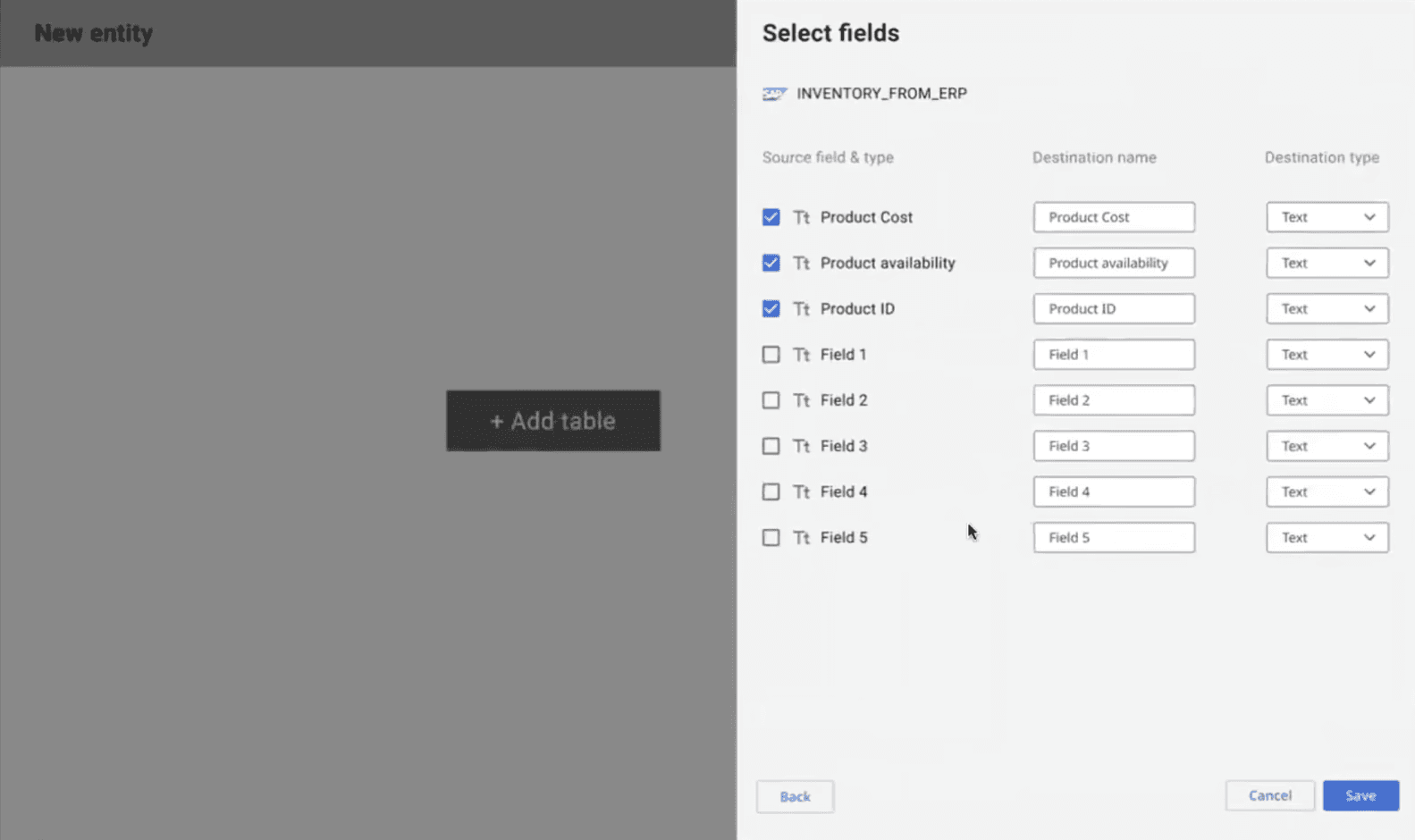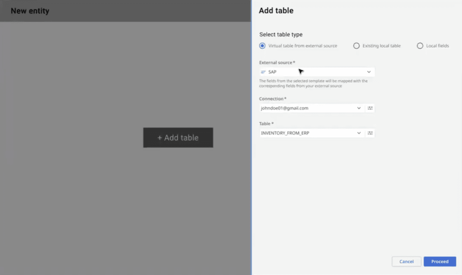 For adding an external object, users need to select the source and the connection / account linked to that source